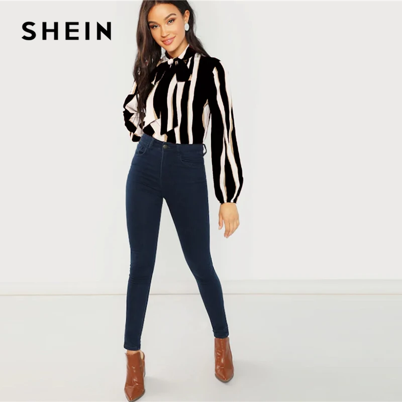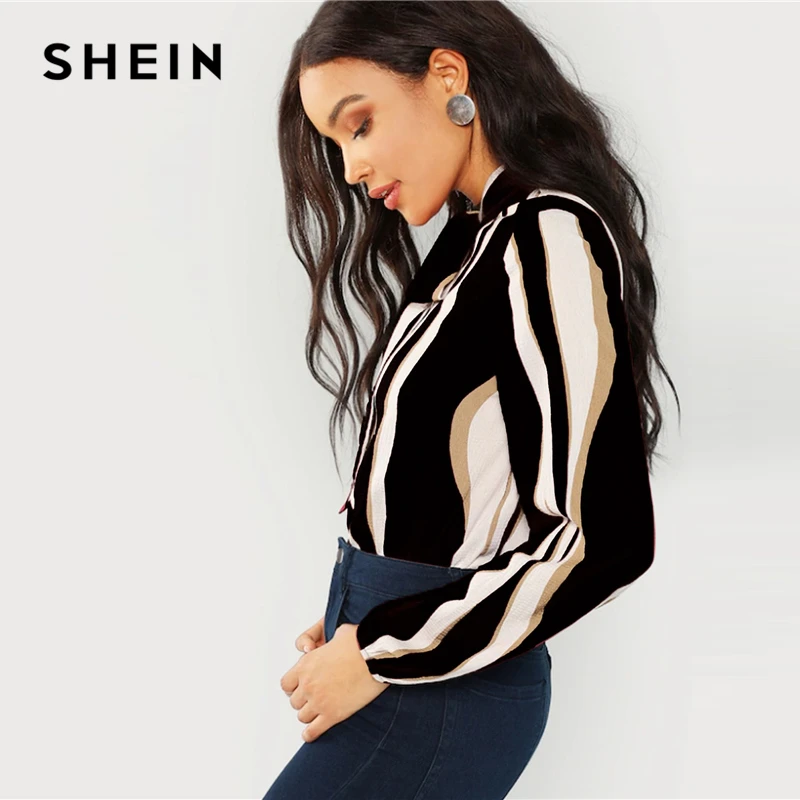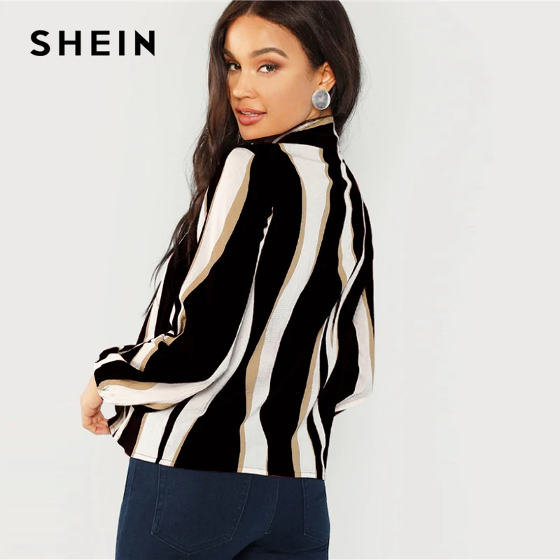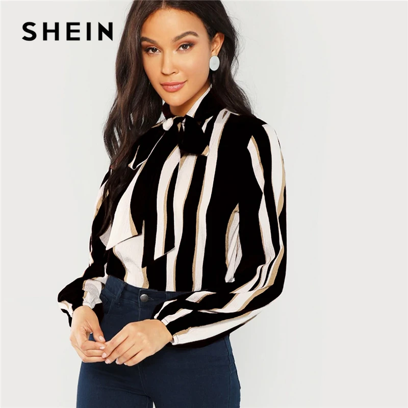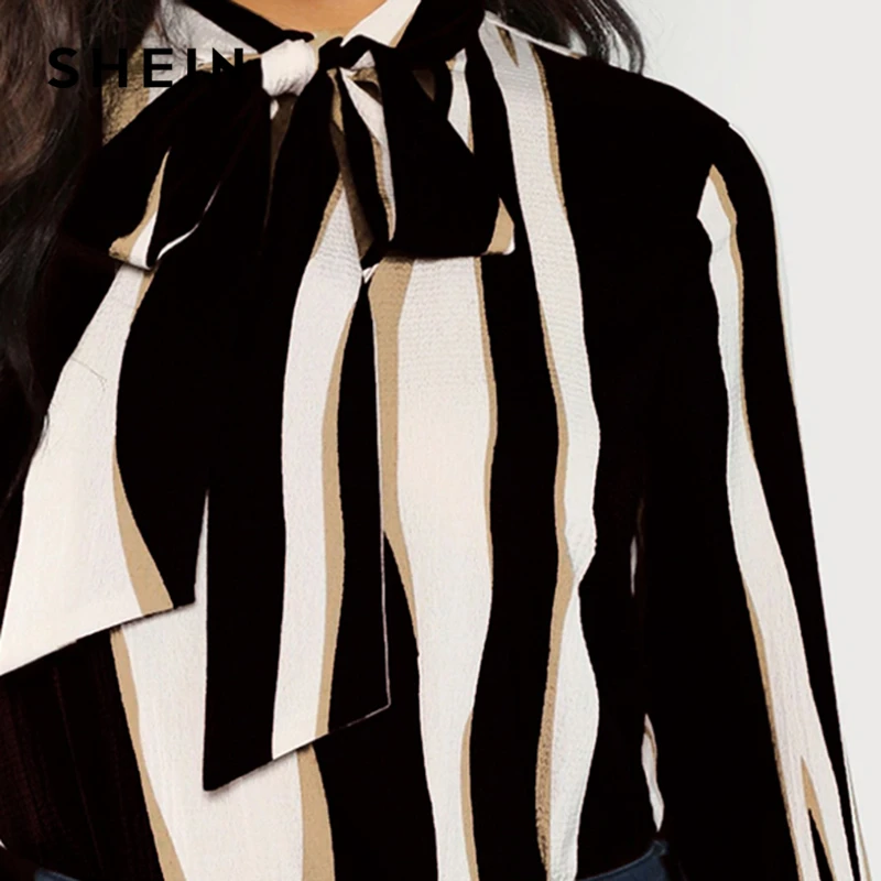 wonderful SHEIN Multicolor Office Lady Tie Neck Striped Pullovers Workwear Blouse Autumn Long Sleeve Modern L