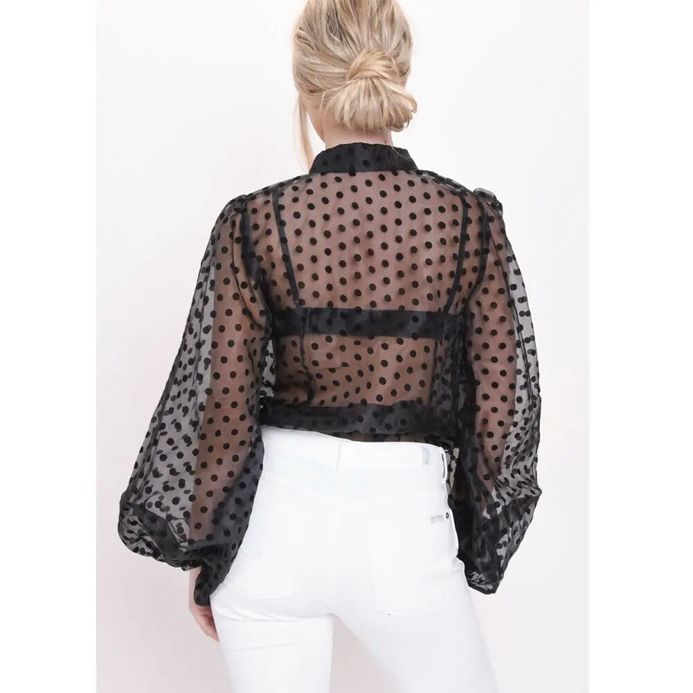 lower price Women Polka Dot Retro Blouse Lady Early Autumn Modern Mesh Shirt Vogue See-through Loose Button Puf