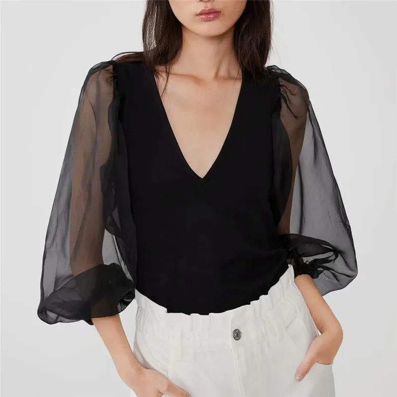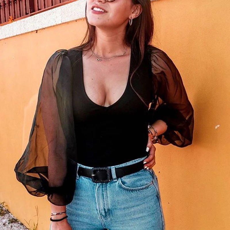 astounding Women sexy deep V neck black blouse patchwork transparent sleeve stretchy shirt female chic stylish