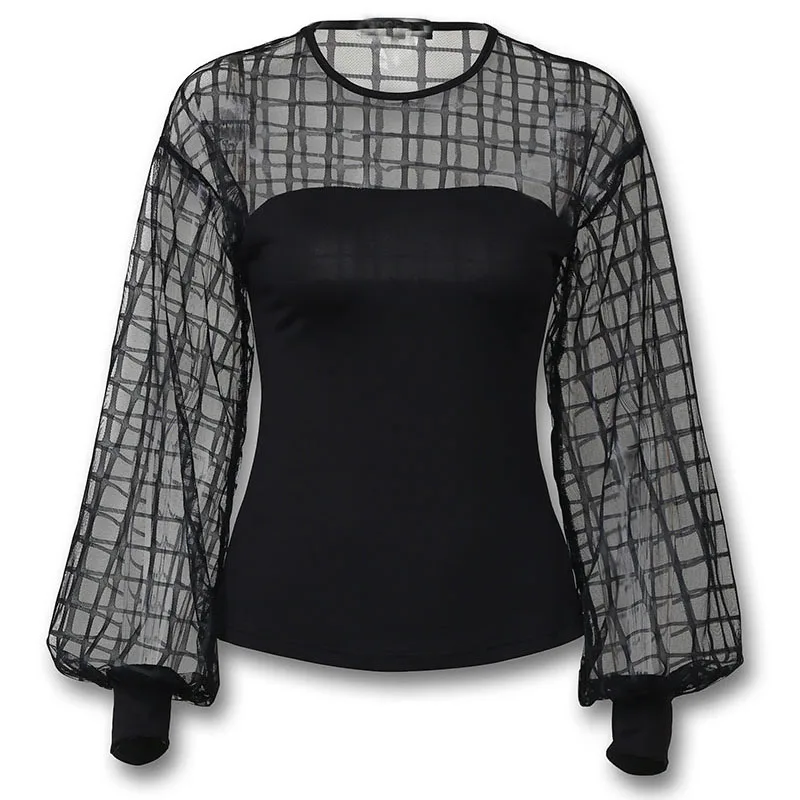 Ideal Women Sheer Grid Mesh Casual Blouse Shirt Women Long Sleeve Tops Blouse Black Plaid Slim Tops Summe