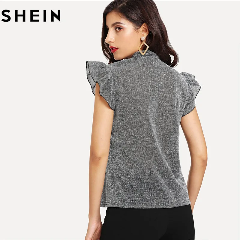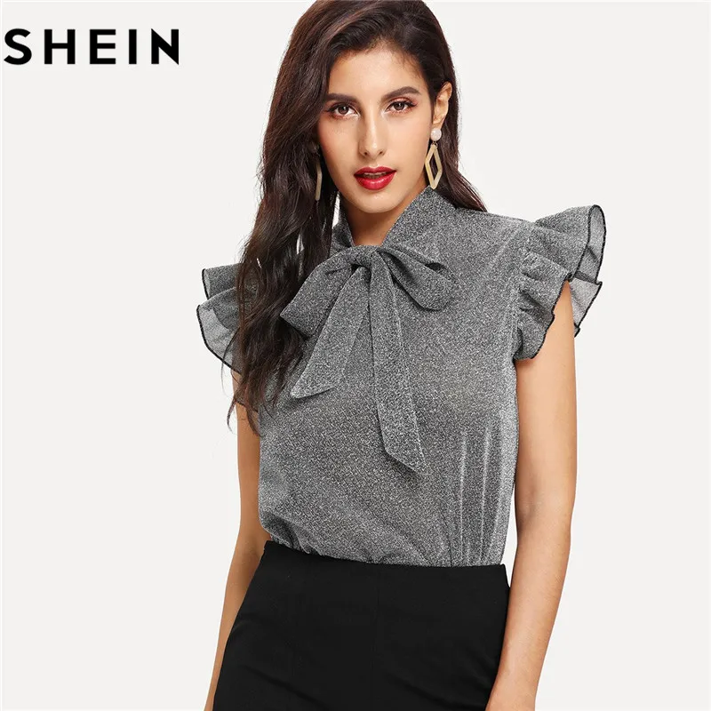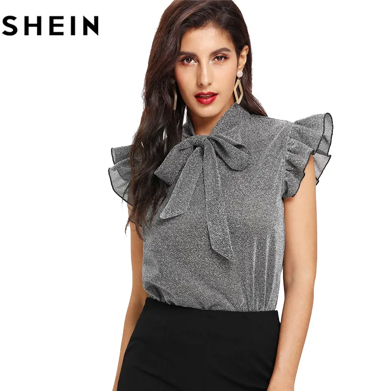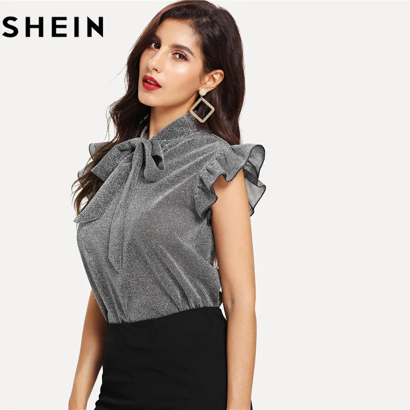 remarkable SHEIN Womens Gray Tied Neck Ruffle Sleeve Summer Casual Tops And Blouses 2018 New Elegant Office La