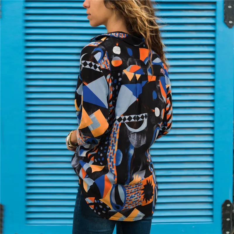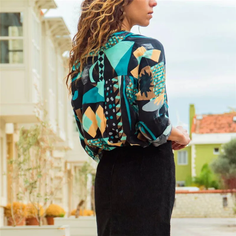 amazing Women Leisure Blouses Long Sleeve Turn Down Collar Office Shirt Geometric Print Blouse Loose Casual