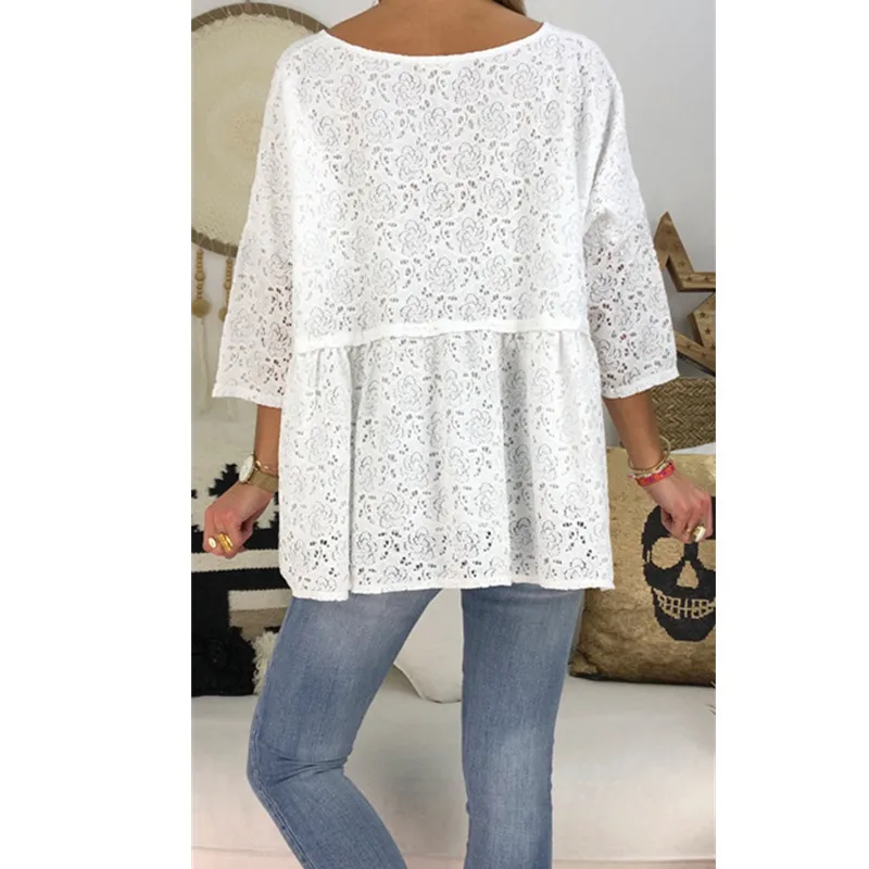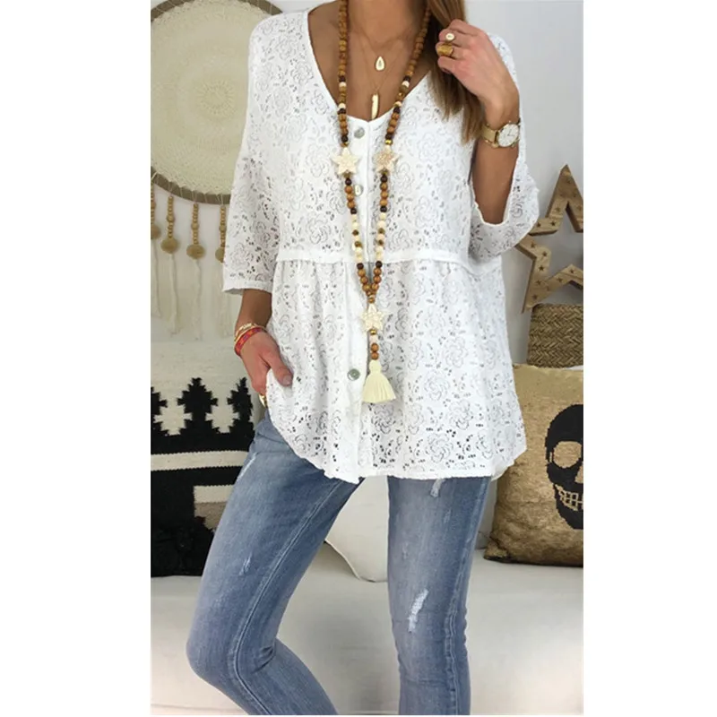 price cut Large size women's shirt 2019 summer autumn solid color lace Blouses Leisure V Neck half sleeve Wom