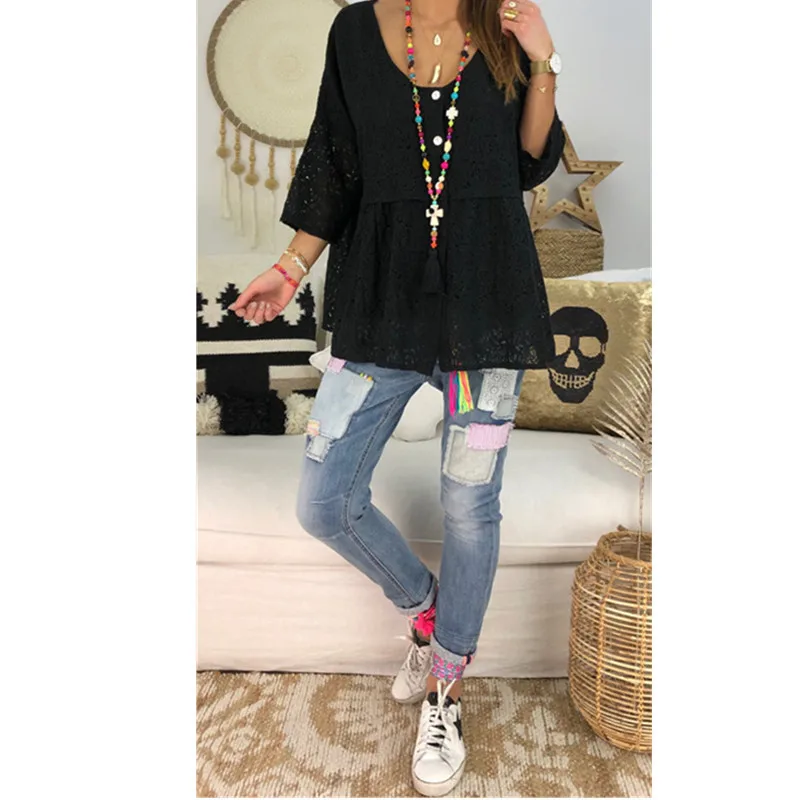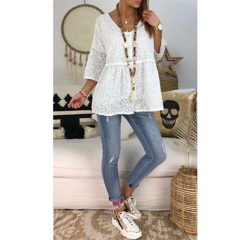 Most effective Large size women's shirt 2019 summer autumn solid color lace Blouses Leisure V Neck half sleeve Wom