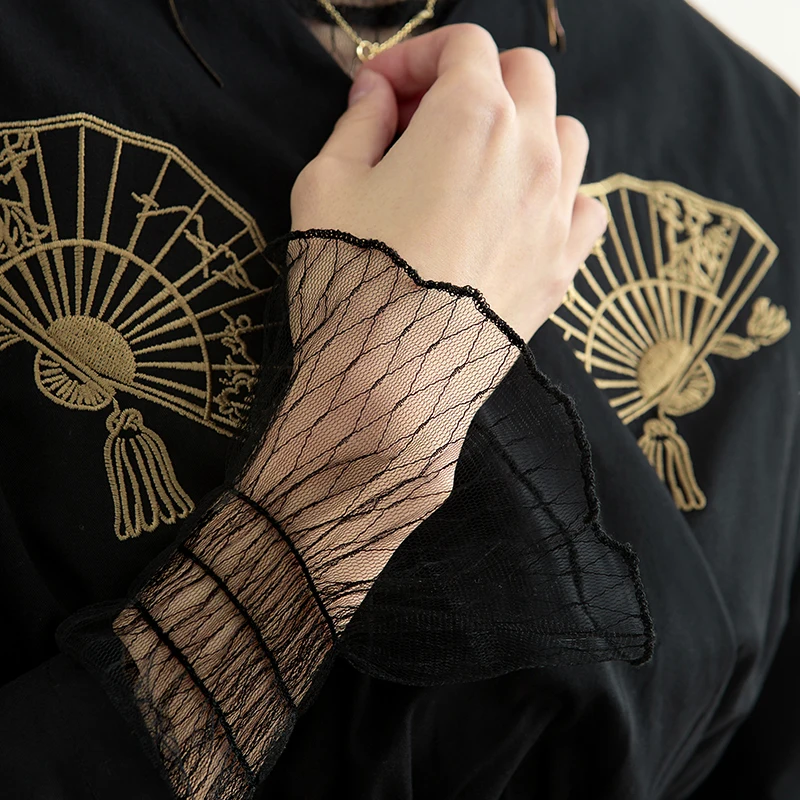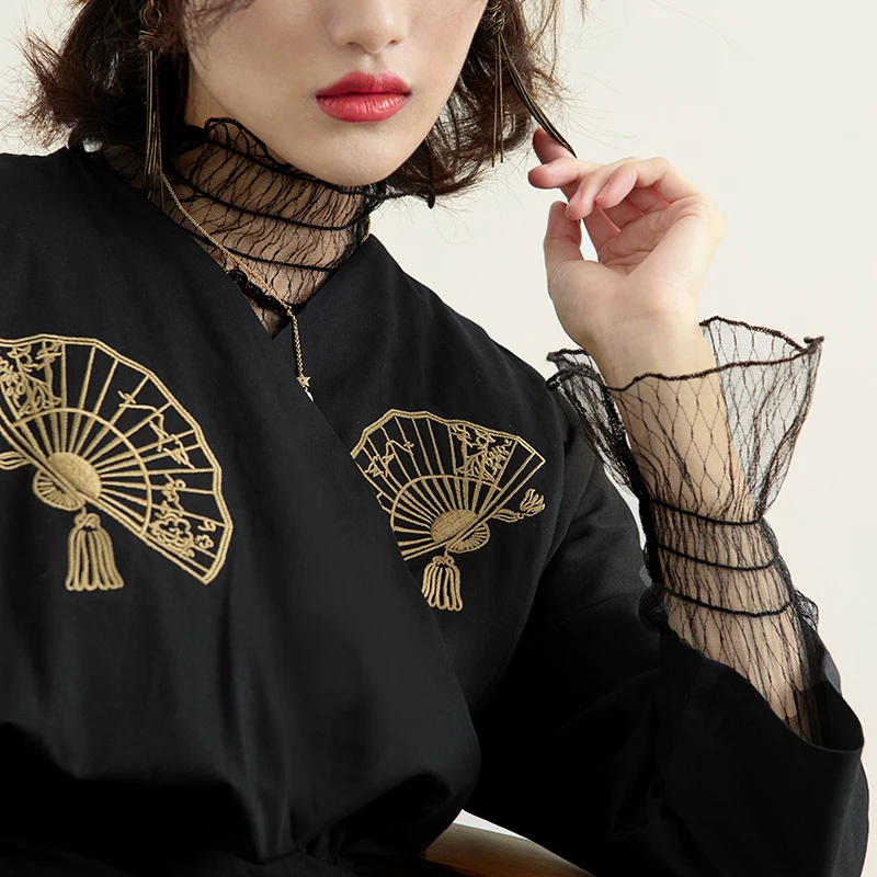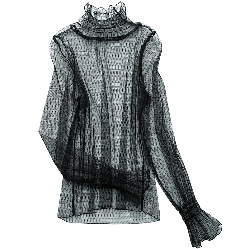 Finest [EAM] 2020 New Spring Summer Stand Collar Long Flare Sleeve Black Loose Mesh Perspective Shirt Wome
