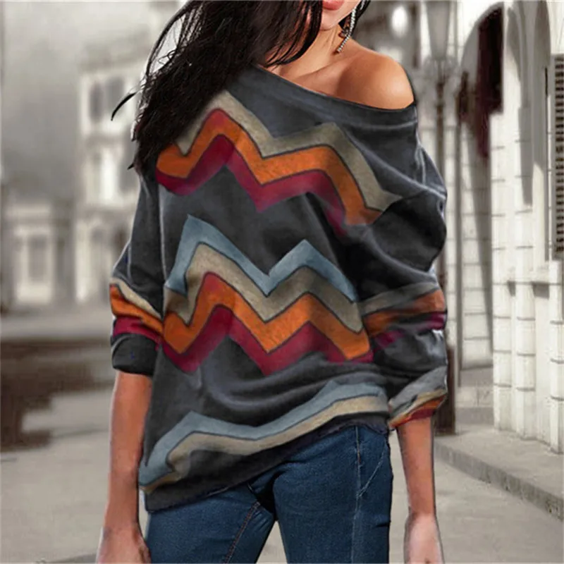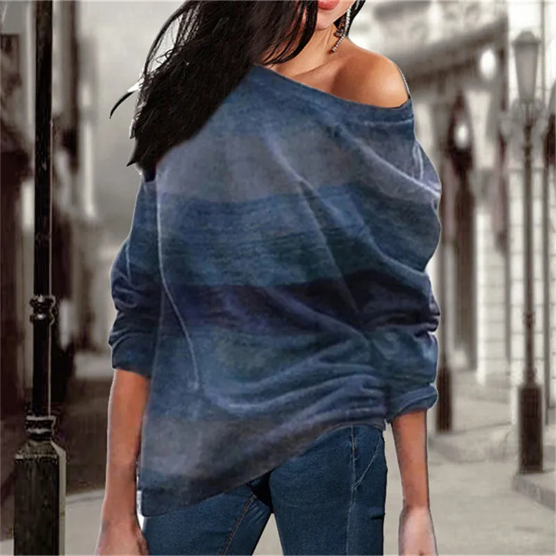 wonderful Women Blouses Off Shoulder Tops Striped Print Pullover Jumpers Casual Knitted Tops Long Sleeve Blou