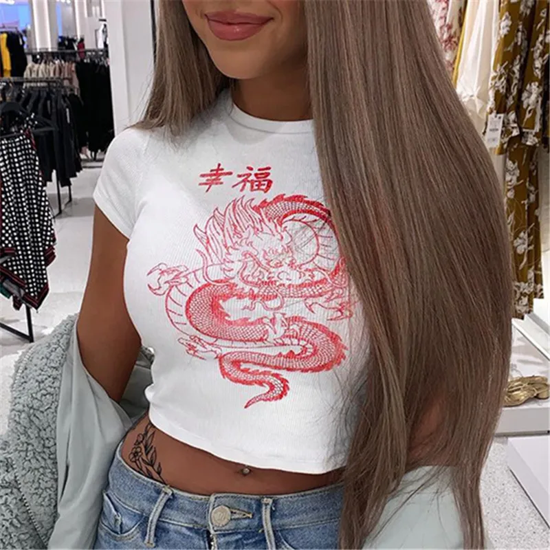 price cut White Chinese Character Dragon Print T Shirt Women Bodycon Casual Tshirt Streetwear Tops Tee Shirt