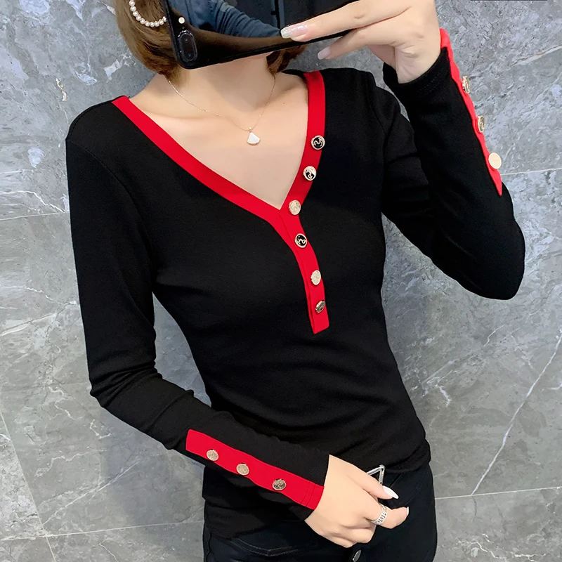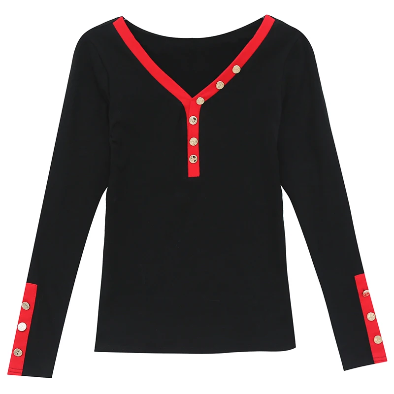 Best Fashion European Tshirt Women 2019 Autumn Winter Patchwork Button Cotton Tops Clothes With Fleece T