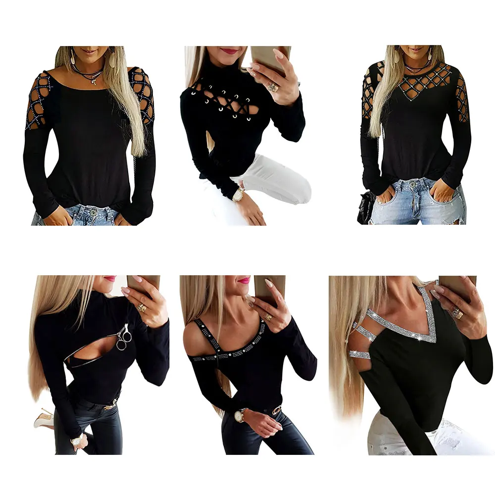 Best Pickyourlook Women Tshirt And Tops Long Sleeve Zipper Sexy Female Tee Shirt Solid Black Stand Colla