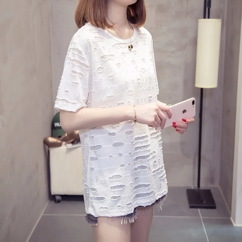 discounted Nkandby Plus Size Hole Women T Shirt Summer Vintage T-shirts Short Sleeve Chic Tops Oversized loose