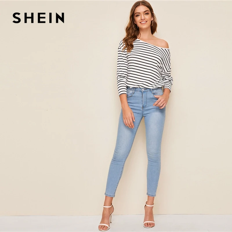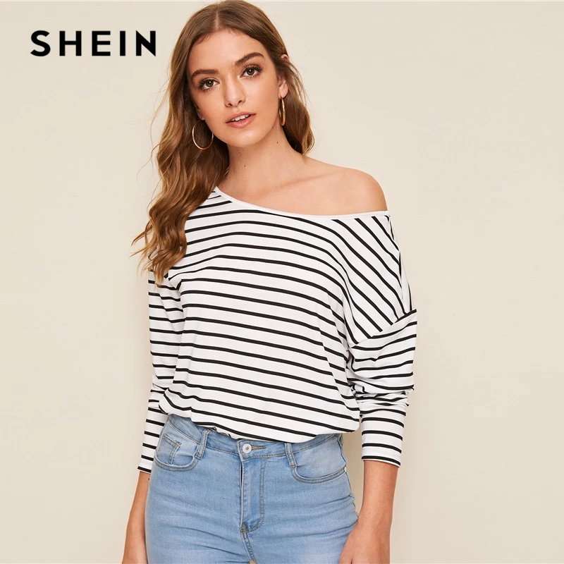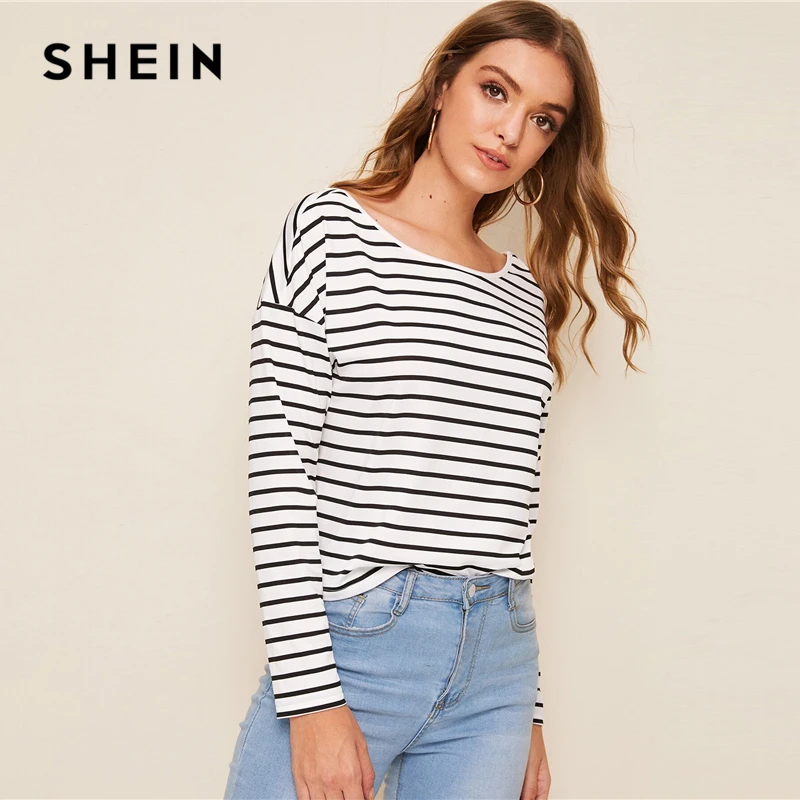 SHEIN Black and White Striped Twist Back Drop Shoulder Sweater Women Autumn Winter V Back Long Sleeve Cute Casual Sweaters,SHEIN Striped Print Asymmetrical Neck Oversized T Shirt Women Tops Drop Shoulder Autumn Long Sleeve Loose Casual Tee Tops, SHEIN Striped Print Asymmetrical Neck Oversized T Shirt Women Tops Drop Shoulder Autumn Long Sleeve Loose Casual Tee Tops