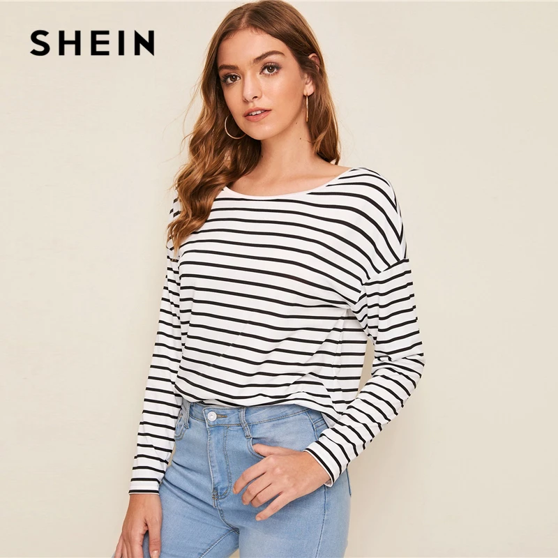 discount SHEIN Black and White Cut Out Twist Back Striped Top Drop Shoulder T Shirt Women Autumn Long Sleeve