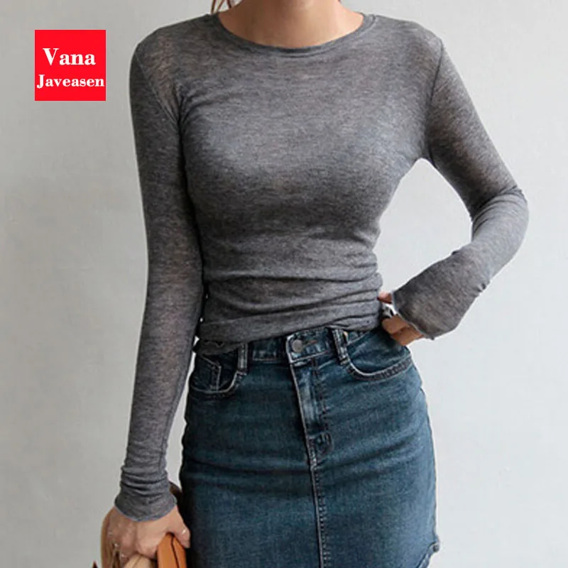 Most effective Slim Plain Tees Woman Tops Autumn Casual Female Long Sleeve Sexy Thin T-shirt Womans Elastic Cotton