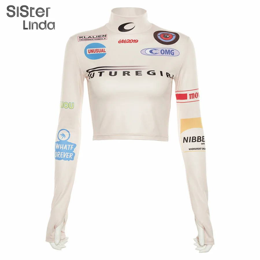 price reduction Sisterlinda Letter Print Cropped Tops Women T-shirt 2019 Autumn Short Tees Elastic Turtleneck Tight