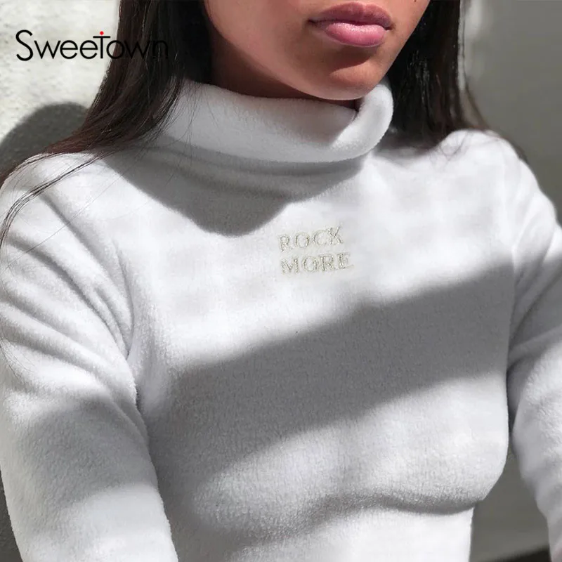 Promo Sweetown 2019 Autumn Winter Turtlneck Teddy Tshirt Women Letter Embroidery Crop Top White Solid Lon