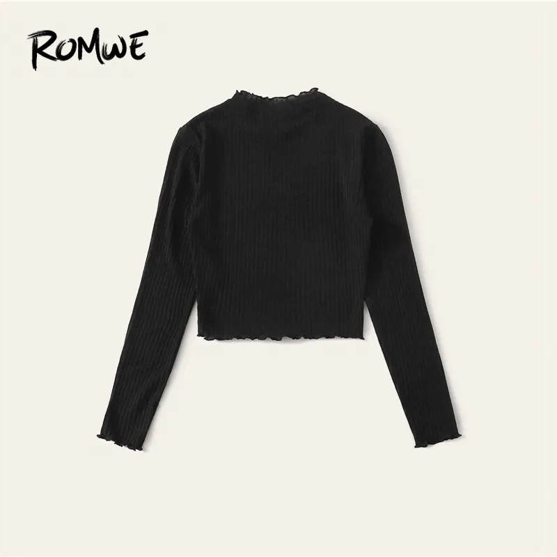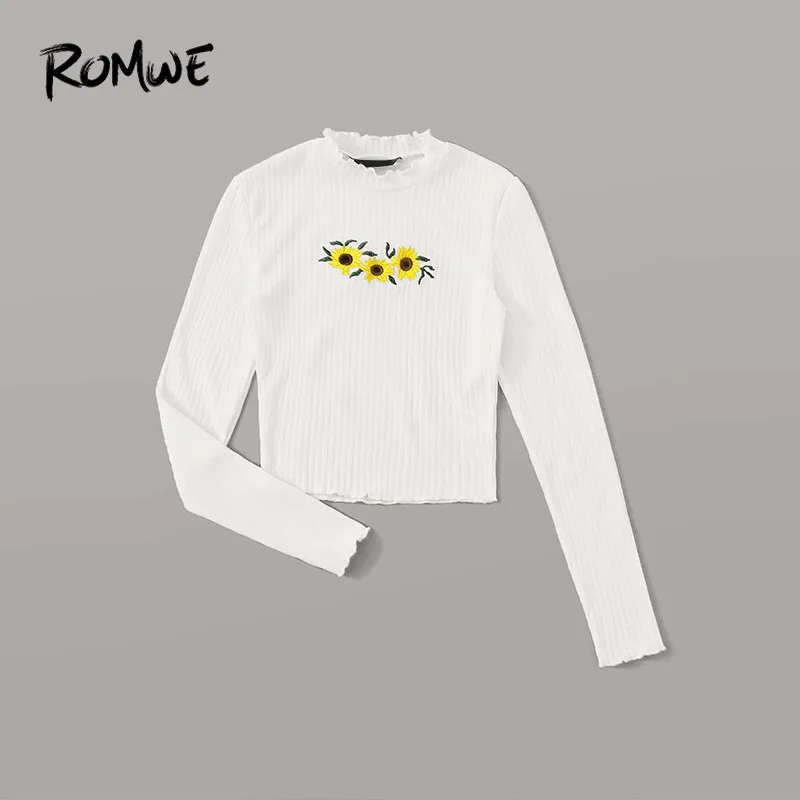 Ideal ROMWE Lettuce Trim Embroidered Rib-Knit Tshirt 2020 Spring Long Sleeve Shirt Women Clothes Casual S