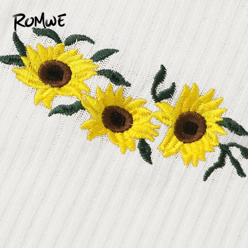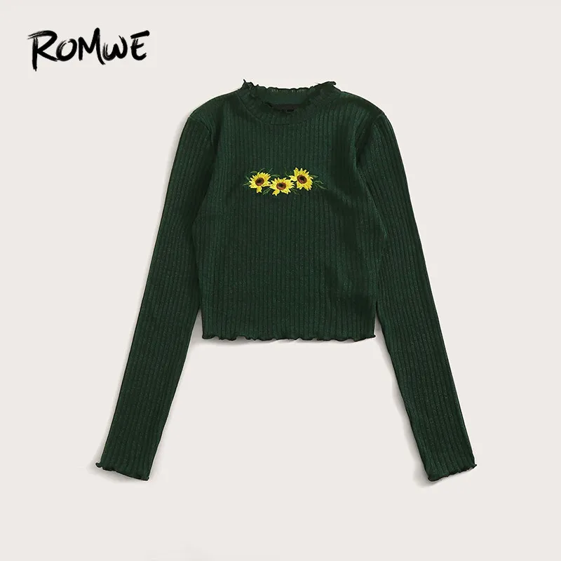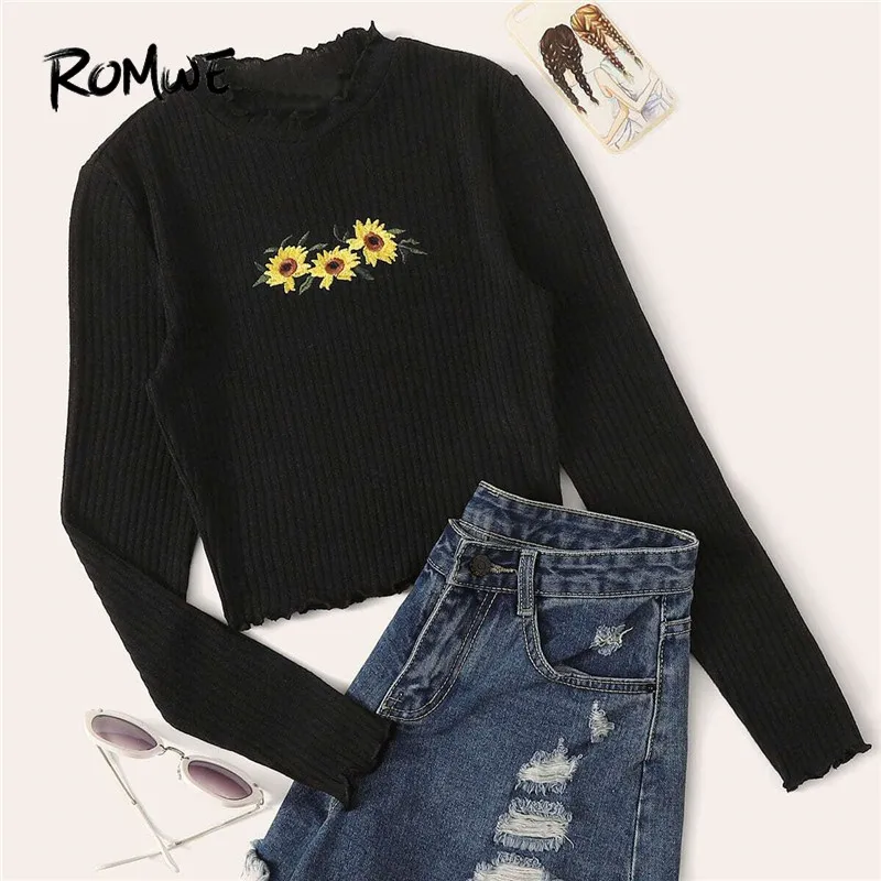 remarkable ROMWE Lettuce Trim Embroidered Rib-Knit Tshirt 2020 Spring Long Sleeve Shirt Women Clothes Casual S